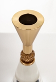 Цей свічник розміром 15x5,5x5,5 см з золотим покриттям і скляною основою — це стильний і вишуканий елемент для вашого інтер'єру. Золотий колір надає йому розкішного вигляду, а скляна основа додає легкості та прозорості. Ідеальний для використання на столах, полиці або комоді, цей свічник стане чудовим акцентом у будь-якому приміщенні. Прекрасно підійде для вечірніх заходів, свят або просто для створення затишної атмосфери вдома. Завдяки компактним розмірам його можна використовувати як частину великої декоративної композиції або окремо.